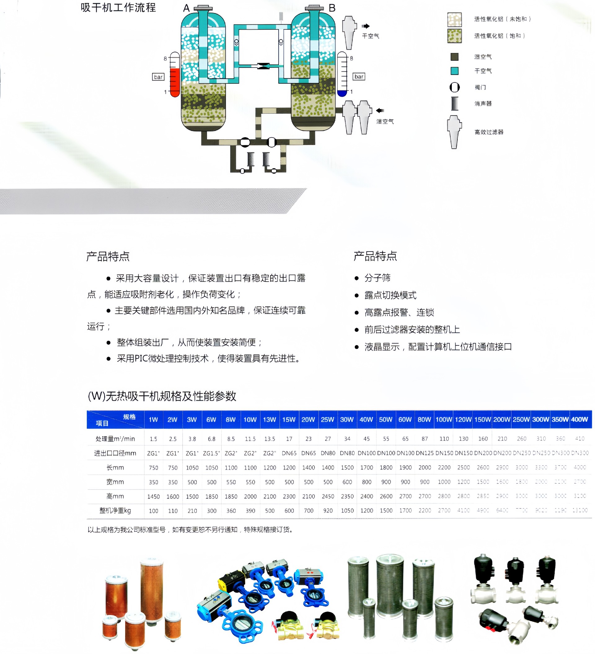 产品描述:无热再生吸附式干燥机是利用“变压吸附”来达到干燥效果的。由于空气容纳水汽的能力与压力成反比,其干燥后的一部分空气(称为再生气)减压膨胀至大气压,这种压力变化使膨胀空气变得更干燥,然后让它流过未接通气流···
